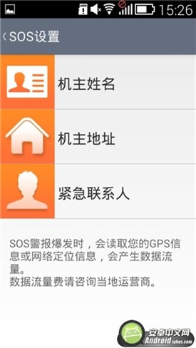 在SOS設置中可以設置自己的個人信息,分別為姓名、地址和緊急聯系人,當開啟SOS模式後就會顯示出這些信息,方便向周圍的人求救。
