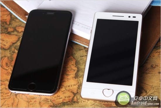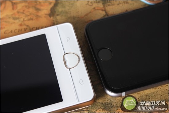 海信心意手機和蘋果iPhone6屏幕上方兩款手機的配置大同小異,都是聽筒、攝像頭與光線距離感應器。但是值得一說的是,海信“心意”屏幕下端的三顆物理按鍵相比iPhone6要更為實用。畢竟中老年人在使用觸控按鍵的時候經常會誤操作,所以實打實的物理按鍵要更能將他們帶入智能手機的世界。而且心形Home鍵可實現快速打開“心連心”功能,當然它還可以在設置菜單裡重新自定義。