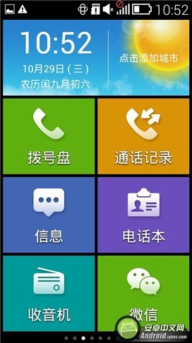 進入系統以後,我們可以看到海信心意手機的操作界面是基於Android4.2.2系統針對中老年人深度優化設計的,單層的系統邏輯非常直觀,配合大字體、多顏色區分以及非常具象化的圖標,操作起來會非常方便。而紅米Note的系統下部采用了四個大方塊組成,目的是為了讓老人更加清晰的看見經常使用的四個功能,相比小方塊的操作界面這樣的設計更具有視覺沖擊力。
