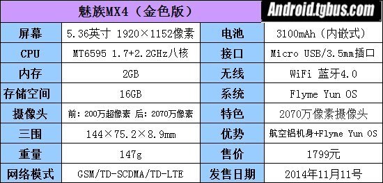 魅族MX4金色版的配置相當不錯,2GB RAM與16/32/64GB ROM組合,同時配備3100mAh大容量電池與2070萬像素攝像頭。而真八核CPU也帶來了不錯的運載能力。屏幕方面,MX4采用了一塊5.36英寸IPS屏幕,分辨率達到FHD級別(分辨率:1920×1152像素)。此外,MX4還將支持TD-LTE、FDD-LTE、TD-SCDMA、WCDMA以及GSM等網絡制式。