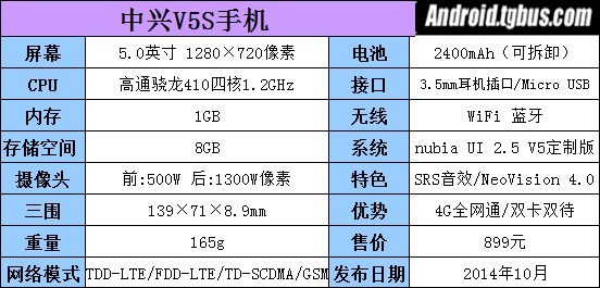 中興V5S采用5.0英寸720p屏幕,1GB內存+8GB機身存儲,2400mAh電池容量,高通骁龍410處理器(Adreno 306 GPU),配備前置500萬(88°廣角)+後置1300萬像素(F/2.2光圈)攝像頭,支持雙卡雙待、三網雙4G(聯通、電信、移動的2G、3G、4G網絡),運行基於Android 4.4.4定制的nubia 2.5 UI。