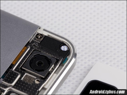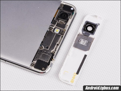 上面的塑料板可以從耳機孔處直接摳起,相對來說比較簡單。拆開直接可以看到下方仍然有金屬板覆蓋,以保證整體機身的牢固性,而塑料板則僅僅是為了保證信號能正常傳輸而設計,以防出現類似蘋果信號門的時間,這也是目前全金屬手機最常見的解決方案。在閃光燈周圍塗有遮擋光線的圖層,保證閃光燈的效果。而整個手機防拆保修螺絲也位於這個地方。