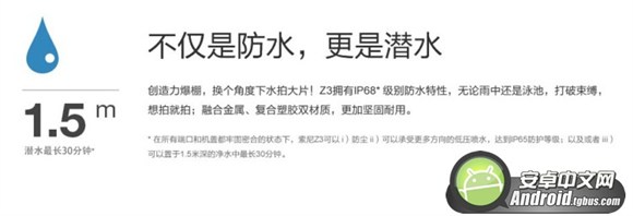索尼Z3的防水防塵級別為IP65/IP68,IP68意味著在所有端口和保護蓋都牢固密合的情況下,索尼Z3可以承受多方向的低壓噴水。而在水浸的前提下,索尼Z3則可以置於1.5米深的淡水中最長30分鐘。