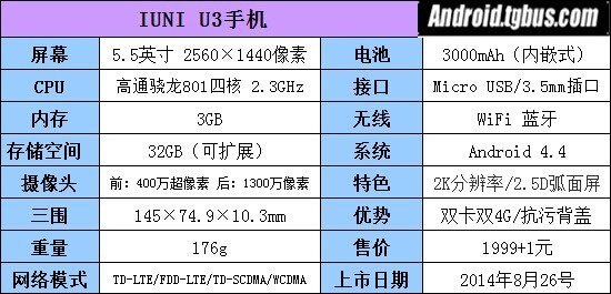 配置方面,U3采用5.5寸2K屏幕,搭載骁龍801四核處理器,配備3G內存+32GB存儲空間,提供1300萬像素OIS防抖鏡頭,內置3000mAh的LG的子母電池,支持雙4G以及雙卡雙待。前置攝像頭搭載了400萬超像素Ultra Pixel超像素攝像頭 ,內置業界頂級的ArcSoft專業影像算法引擎,以確保拍照畫質出眾。
