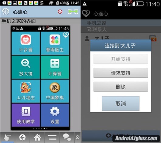 軟件名為“心連心”通過WiFi或者3G以上網絡均可實現。界面如下,遠程操控可以直接看到父母手機的界面並且可以“代替操作”底部有三顆虛擬按鍵分別是返回、主頁與菜單鍵。操作體驗上比較流暢同步的效果延遲沒有太大影響。同時開啟了語音對話,父母直接用語音來求助。確實非常實用。