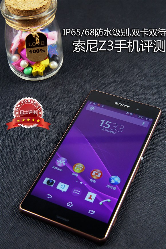 索尼Z3目前有黑色、白色和琥珀金等三中,這次我們拿到的琥珀金版本,外殼使用了金屬材料邊框和後殼,後殼還增加了玻璃材料以增強質感。整體感覺以金屬為主配合華麗的顏色和玻璃質感的通透,使得Z3成為今年下半年發布的旗艦手機中最典雅的一款。