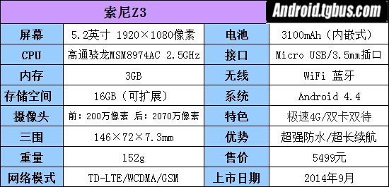 索尼Z3的處理器升級至高通骁龍801(MSM8974AC)四核處理器,主頻為2.5GHz,內置3GB運行內存以及16GB容量內置存儲,並且支持最高128GB存儲卡擴展。另外,索尼Z3還是一款支持4G網絡雙卡雙待手機。