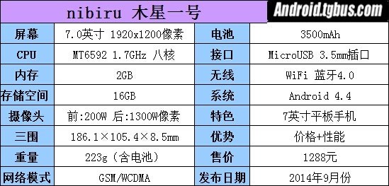 “木星一號”主打大屏影音功能,屏幕尺寸為7英寸,同時配備MT6592H 1.7GHz真八核處理器、原裝進口頂級LTPS低溫多晶硅液晶屏(1920*1200超全高清視網膜級辨率)以及2GB ROM。拍照環節上,木星一號采用了1300萬+200萬像素的攝像頭組合方式,並具備人臉識別、智能美顏功能。