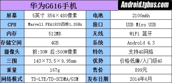 華為G616擁有5英寸的屏幕,分辨率為854×480,CPU采用了Marvell PXA1920四核1.2GHz處理器,擁有512MB RAM與4GB ROM,500W像素攝像頭和2100mAh電池容量也都能看出它是入門級別。