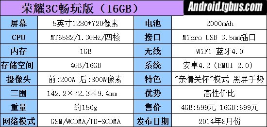 3C暢玩版搭載了聯發科1.3GHz四核MT6582處理器,1GB運行內存以及16GB機身存儲空間(標准版ROM為4GB)。此外,3C暢玩版還有一塊5英寸720P顯示屏,拍照方面則是前置200萬像素與後置800萬像素攝像頭的組合方式。系統UI則在安卓4.2基礎上增加了華為自家的EMUI 2.0,使其界面風格更符合國人習慣。