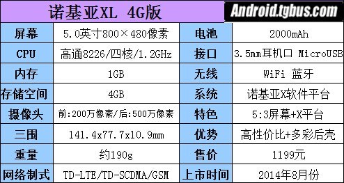 諾基亞以實用和性價比為主,XL 4G版也不例外。硬件方面搭載了高通骁龍MSM 8226 1.2GHz四核處理器,並同時擁有1GB ROM與4GB RAM。屏幕則使用了一塊5英寸LCD屏幕,分辨率達到了800×480像素。此外,它還支持中國移動TD-LTE 4G網絡。系統方面,XL放棄了WP系統,改用安卓4.1系統,並經過諾基亞X軟件平台深度處理。