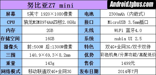 努比亞Z7 mini擁有5英寸1080P屏幕,搭載了高通骁龍801(MSM8974AA)四核2.0GHz處理器,擁有2GB RAM和16GB ROM,前置500W像素,後置1300W像素攝像頭。2300mAh電池不可拆卸,支持雙4G+全網3G網絡模式,搭載了基於Android 4.4的nubia UI 2.5系統,目前官方售價為1499元。