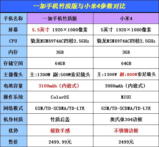 之前小編也做過一加手機的詳細評測,我們對它的配置也有了較為深入的了解。不過,在小米4發布後,一加也就有了競爭對手,兩者配置相差不多,設計也各有所長,為了能讓大家對兩者有更為詳細的了解,所以做了上面的對比表格。一加手機竹質版除了後蓋材質外,其它的配置完全以普通版一樣。從上圖我們可以看到,一加手機采用了5.5英寸的大屏,3100mAh的大容量電池,它的主要特點是極致手感,尤其是搭配上竹質後蓋,手感更加舒適;小米4的前置攝像頭擁有800W像素,采用奧氏體304的不銹鋼邊框,側邊要比一加竹質版手機好一些。