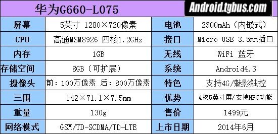 華為G660搭載了高通MSM8926四核處理器,1GB RAM和8GB ROM內存,最大支持32GB擴展卡,前置130萬攝像頭,後置800萬攝像頭,安卓4.3系統,支持移動3G、4G網絡,支持NFC功能。配備5英寸1280×720分辨率屏,2300mAh電池。