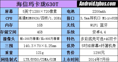 海信瑪卡珑630T采用了高通MSM8926四核處理器,主頻達到1.2GHz,而RAM則為1GB。此外,用戶還可通過TF卡將手機存儲容量最大擴展至32GB。屏幕方面,瑪卡珑630T搭載5英寸IPS屏幕,並使用OGS全貼合工藝,使反射光減少。系統上,瑪卡珑630T采用了前200萬像素後800萬像素的搭配方式,而且在拍照軟件上也有諸多功能供消費者選擇。