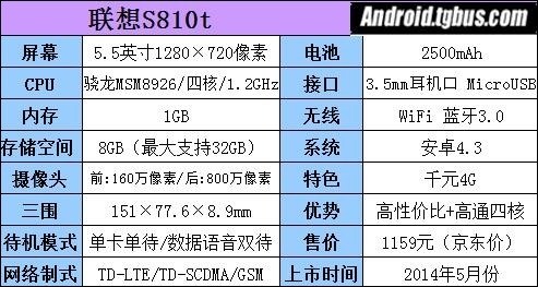 聯想S810t配備了一塊5.5英寸IPS屏幕,分辨率達到720P級別。處理器則采用高通骁龍8926,它具備四核處理核心,主頻達到1.2GHz,同時在1GB ROM的輔助下,運行大部分軟件也都沒問題。由於這部手機與移動有合作關系,所以在網絡制式上也偏重於移動,集成了TD-LTE、TD-SCDMA和GSM。