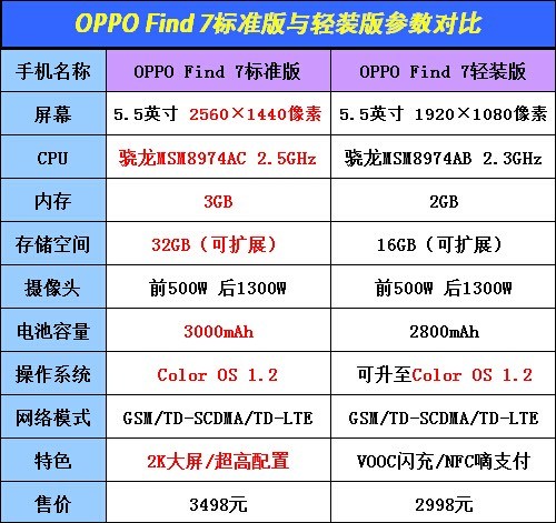 OPPO Find 7標准版與輕裝版的配置對比,從上表中可以看出,標准版的OPPO Find 7在配置方面非常強大。它擁有5.5英寸2560×1440的分辨率,搭載高通骁龍四核2.5GHz處理器,擁有3GB的RAM和32GB的ROM,電池容量增加至3000mAh,采用最新的Color OS 1.2系統並支持移動4G,目前官網售價為3498元。