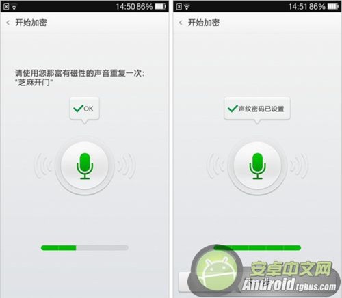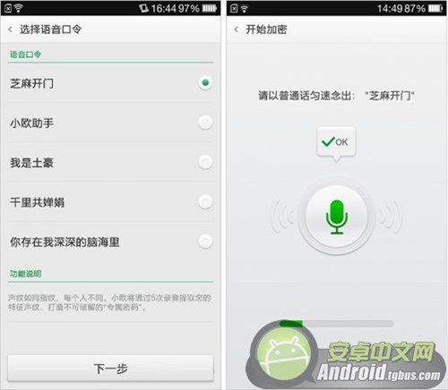 開啟聲紋解鎖功能,首先是進入到手機的設置功能,在這裡面有一個安全服務功能,在裡面有一個屏幕鎖定功能,最後一個就是聲紋解鎖功能了,點擊進去就可以開啟一加手機聲紋解鎖功能了。然而設置密碼的方式與圖案密碼設置方式是一樣的。然系統有默認“芝麻開門”“小歐助手”“我是土豪”等短語,用戶也可以設置一個自己想要的語音密碼。巴士小編需要提醒的是,錄制聲紋識別解鎖密碼的時候,最好找一個安靜的地方,防止有其他聲音錄入,從最一開始到最後,一共要輸入五遍,你能記住嗎?