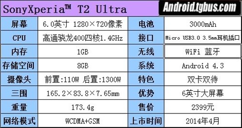 索尼手機的特點就是好看,並且開機鍵移到右側邊後對使用者來說非常的方便。今天評測的這款手機Xperia T2 Ultra是繼 Xperia Z Ultra後索尼又一款屏幕尺寸飙到6寸的機型,而且加上雙卡雙待等實用功能才售價2399,性價比是非常高的。下面咱們來一起看看這款手機的評測吧!