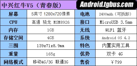 首先我們來看一下這款智能手機的硬件配置。中興V5配備了5.0英寸屏幕,分辨率為1280x720,稍顯落後。打在了高通的四核處理器,青春版配備1GB RAM外加4GB ROM,能量版配備2GB RAM外加8GB ROM。配置在當前市場中勉強可以算上中端。內置的2400mAh電池倒是相比同水平機型具有一定優勢。