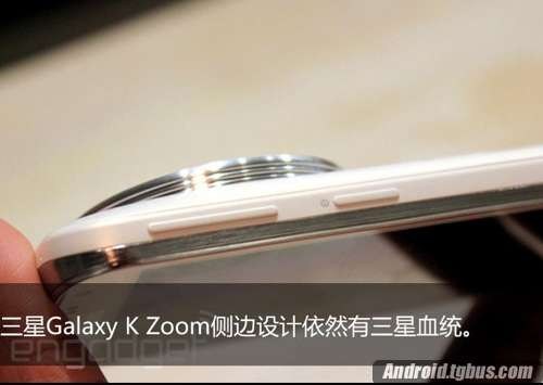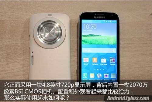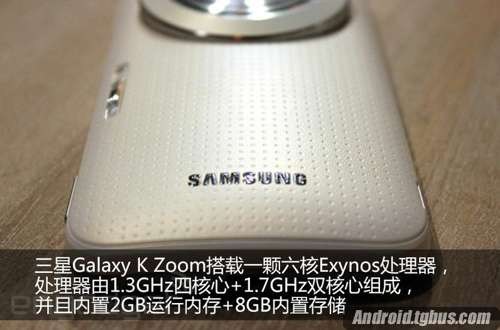 Galaxy K Zoom相對上一代升級不小,它配備4.8英寸720p分辨率屏幕,2430mAh電池,支持Cat. 4 LTE極速網絡,一枚六核心Exynos處理器,其中包含1.3GHz四核處理器以及1.7GHz雙核處理器,2GB RAM,8GB機身存儲空間(部分市場為16GB),最高可擴展至64GB,運行Android 4.4Kitkat系統。