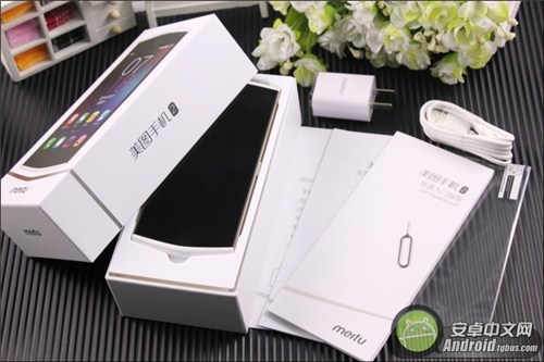 不同於賽車限量版,普通版美圖手機2 的包裝采用了簡單的紙質盒子設計。底面貼有相關配置和進網許可,內部構造則與iPhone包裝盒相似:第一層是手機,第二層是紙質說明材料、貼膜與取卡針,第三層則是充電器和MicroUSB數據線。