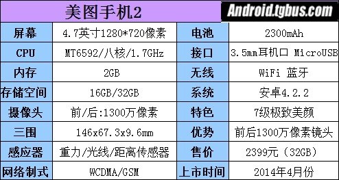 不同於美圖手機1S,第2代產品采用了全新的設計,硬件配置方面也更是有了不小的進步。美圖手機2當然要主打美顏,所以在前後攝像頭上均選用了1300萬像素鏡頭,另外還搭載了聯發科MT6592八核處理器和富士通Milbeaut圖形處理器。內存配備了2G RAM+16G/32G ROM的內存組合,屏幕則采用了一塊4.7英寸1280x720像素分辨率的IPS屏幕。