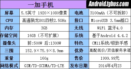 雖然一加手機主打的是外觀和手感,但它在硬件配置方面也是不弱,完全可以達到高端旗艦手機的配置要求。一加手機擁有5.5英寸的大屏和1920×1080的像素。搭載高通骁龍801四核2.5GHz處理器,擁有3GB的RAM和16GB的ROM,3100mAh的電池可支持用戶使用1.5天以上,它還是一部一直移動4G的手機。這些硬件配置與HTC One M8幾乎一樣,但它的售價僅為1999.99元,可以稱得上是目前最具性價比的手機了(HTC One M8售價5299元)。
