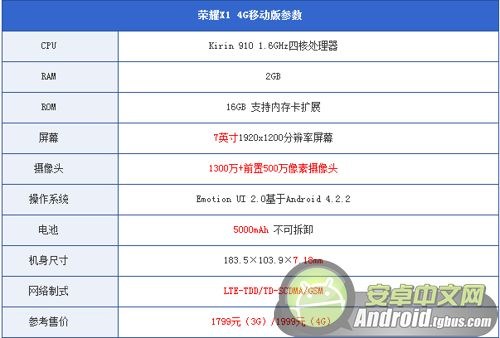 華為榮耀X1 4G版配置的是7英寸的1920*1200像素的屏幕,屏幕材質使用的是LIPS技術,像素密度高達323ppi,機身內存是2GB的,擴展內存是16GB或是32GB的,內核配置的是Kirin 910 1.6GHz四核處理器,攝像頭配置的是1300萬後置和500萬前置,後置加入了F2.2超大光圈,28MM廣角鏡頭,采用Hybrid IR藍玻璃材質的5枚鏡頭組件,使用戶的拍攝效果達到最佳的效果,另外該平板手機電池容量是5000mAh,足夠支持4天導航。