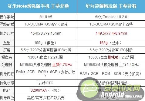 下面就主要針對紅米Note和華為榮耀暢玩版在體驗方面的差異上有針對性的做一下對比,先不看這兩款手機的性能誰更強大,知己知彼,方才百戰百勝。下面就來仔細對兩款手機的參數進行對比吧。