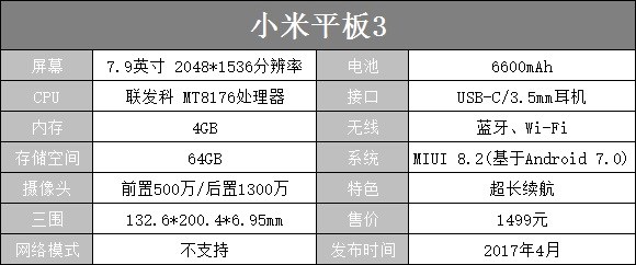 按照慣例,我們先看下小米平板3的配置,下面給看官老爺上一張小編整理的配置圖: