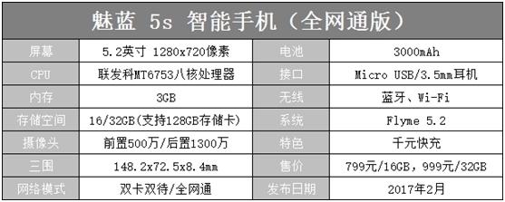 魅藍5s采用5.2英寸高清屏幕,搭載聯發科MT6753八核處理器,擁有3GB的運行內存,16/32GB的本機容量還可支持128GB的存儲卡,前置500萬和後置1300萬的像素可以滿足用戶的拍攝需求。3000mAh的電池加上18W的快速充電能夠讓用戶無需擔心手機電量。