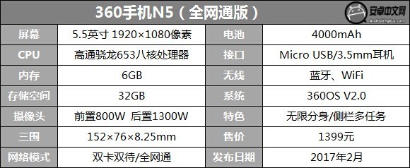 360手機N5采用5.5英寸1080P屏幕,搭載高通骁龍653八核處理器,擁有6GB+32GB的大容量內存組合,前置800W和後置1300W像素也能滿足用戶所需。內置4000mAh大容量電池和雙卡雙待全網通網絡制式,目前官方售價為1399元。