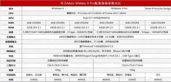 我們直接通過參數對比可以有一個直接的認識,相信通過比較,大家可以知道哪一款更適合自己,總體來說,Mate 9系列的定價符合其配置和工藝,是非常值得入手的旗艦手機,下面就來看看華為Mate 9與華為Mate 9 Pro詳細配置規格參數對比: