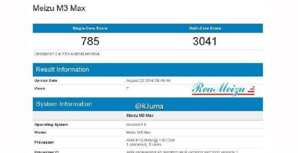 GeekBench數據庫中出現的手機型號為MeiZu M3 Max,應該就是魅藍Max無誤,但是配置方面卻和傳聞大相徑庭。跑分顯示,該機單核得分785分,多核得分為3041分,該機搭載的是聯發科MT6755M處理器,也就是聯發科Helio P10八核處理器,主頻為1.0GHz,擁有3GB運存,運行Android 6.0系統。