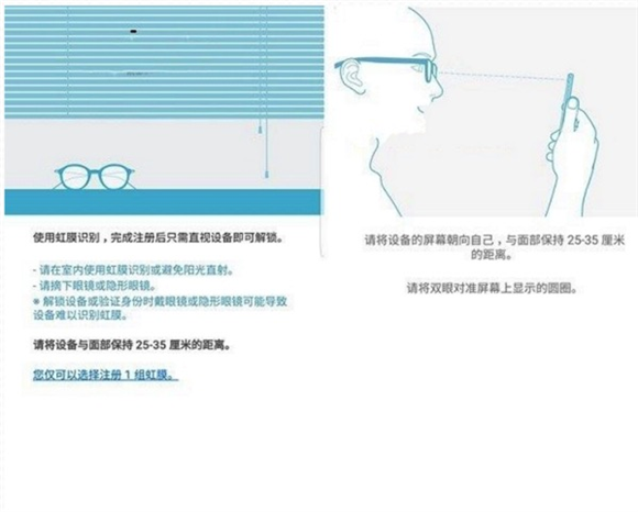 二、看看虹膜識別免責聲明之後,按照提示就可以開始設置了。在設置虹膜識別之前,需要注意2個事項:
