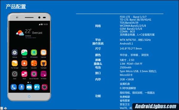 配置方面,中興Blade A2采用了5英寸720P屏幕,搭載了主頻1.5GHz聯發科MT6750八核處理器,內置2GB內存+16GB存儲空間。擁有前置500萬像素+後置1300萬像素攝像頭,內置2500mAh容量電池,運行基於於Android 5.1的Mifavor3.2用戶界面。網絡方面,擁有雙4G版和全網通版,支持雙卡雙待,同時該機還搭載指紋指紋識別功能,擁有華爾金 、珍珠銀 、深空灰三種配色可選。