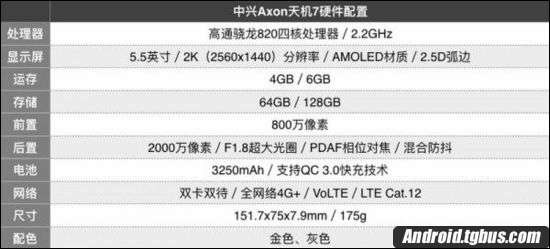配置上,中興Axon天機7采用高通骁龍820四核處理器,輔以4GB運存+64GB存儲空間(標配版)、4GB運存+128GB存儲空間(高配版)或6GB運存+128GB存儲空間(頂配版)。采用一塊5.5英寸2K分辨率AMOLED,表面玻璃為2.5D弧邊設計,其中頂配版配備壓力觸控2.0技術。攝像頭部分為後置2000萬像素+前置800萬像素攝像頭組合,其中後置攝像頭擁有F1.8超大光圈、混合防抖、PDAF相位對焦技術。