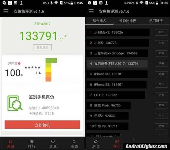 通過安兔兔來測試了一下這款新機的跑分成績,最終跑分成績為133791分,我們會發現雖然該機並未位居第一,但基本上位於跑分前列,是一個相當不錯的成績。