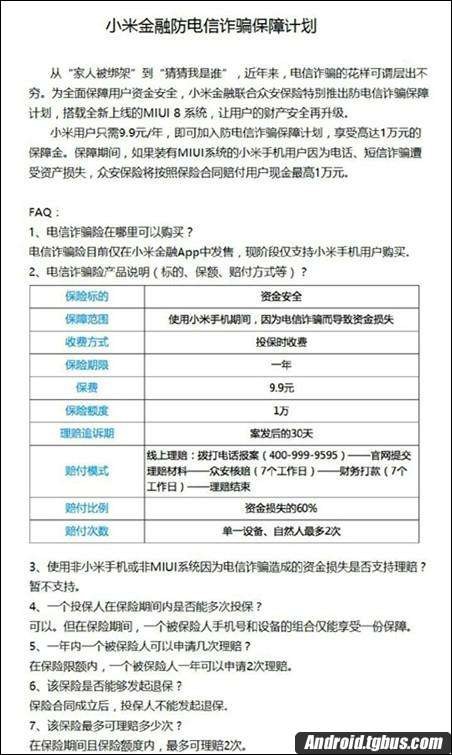 從小米發布的公告中可以看到,聯合眾安保險為裝有MIUI系統的小米手機用戶推出防電信詐騙服務,小米用戶只需要每年支付9.9元,一旦因電信詐騙資產受損,眾安保險將按照合同賠付用戶損失,該保險的賠付比例為資金損失的60%,最高賠付1萬元。