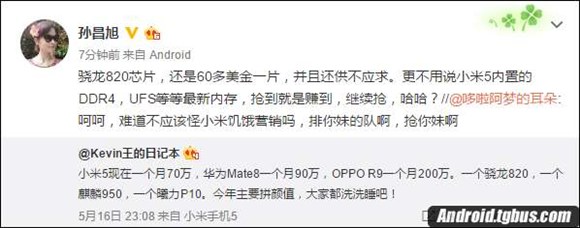 昨天,IHS中國研究總監王陽在微博上爆料,小米5目前一個月供貨量在70萬台左右(Mate 8月供貨量80萬台,OPPO R9月供貨量在200萬台左右。),相比之前產能已經提升很多,但依然滿足不了要求,這到底是什麼情況呢?現在,業內分析師孫昌旭在微博上強調,小米5產能跟不上還有一部分原因是骁龍820供應跟不上造成,這款高通最新的處理器成本價60多美金一片,在市場上相當搶手。