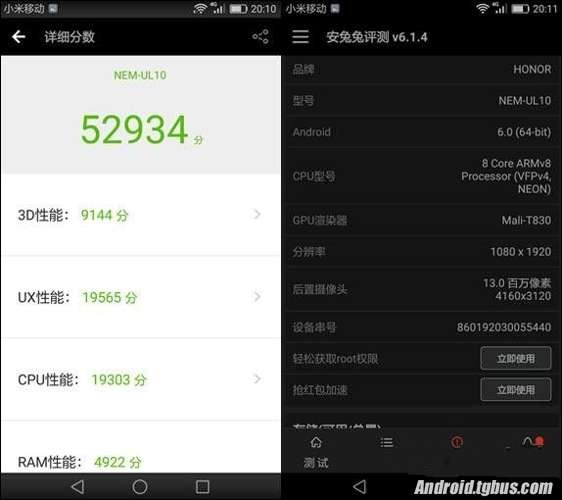 至於跑分,從實際安兔兔跑分測試來看,榮耀5C安兔兔跑分成績為52934,對於這個跑分基本上和聯發科MT6795、高通曉龍808打平。