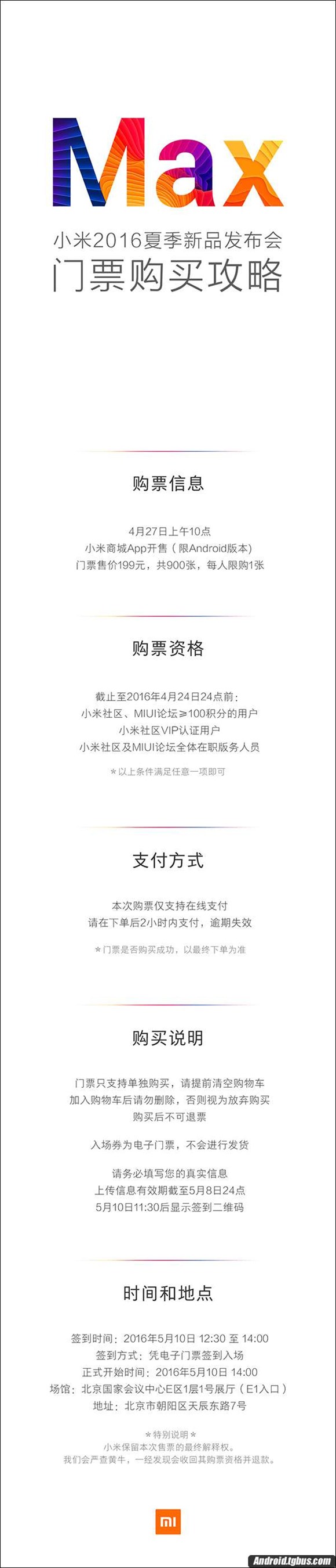 據悉,4月27日上午10點大家使用安卓手機下載小米商城APP,即可以參加小米Max發布會門票的搶購。雖然小米Max發布會門票定價199元,但是按照慣例每次小米發布會都將有禮品相贈,比如上次小米5發布會就送出了一台小米盒子3,一個小米光感手環,關鍵還有小米5的F碼。所以這次小米Max的與會人員至少也能獲得一枚小米Max的F碼,總的來說199元還是物有所值的。
