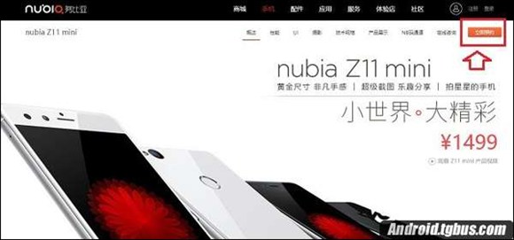 2、努比亞網站找到nubia z11 mini,然後點擊進入預約,之後點擊右上角的“立即預約”,如下圖。