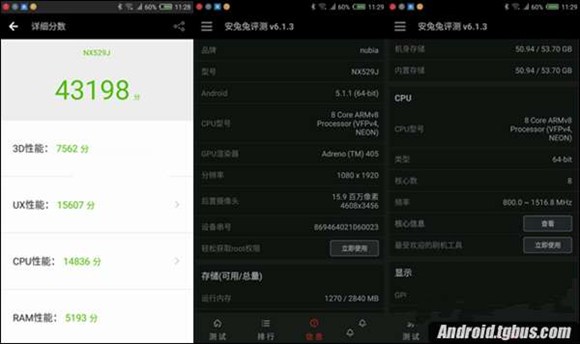 通過最新版安兔兔V6.1跑分軟件測試後,我們不難看到努比亞Z11 mini安兔兔跑分成績為43198分,從跑分成績來說,這樣的跑分並不沒有達到理想的狀態,之前的高通曉龍615處理器也可以跑出4萬分成績,時隔一年,性能僅提升了15%,這點不免讓很多人有點失望。