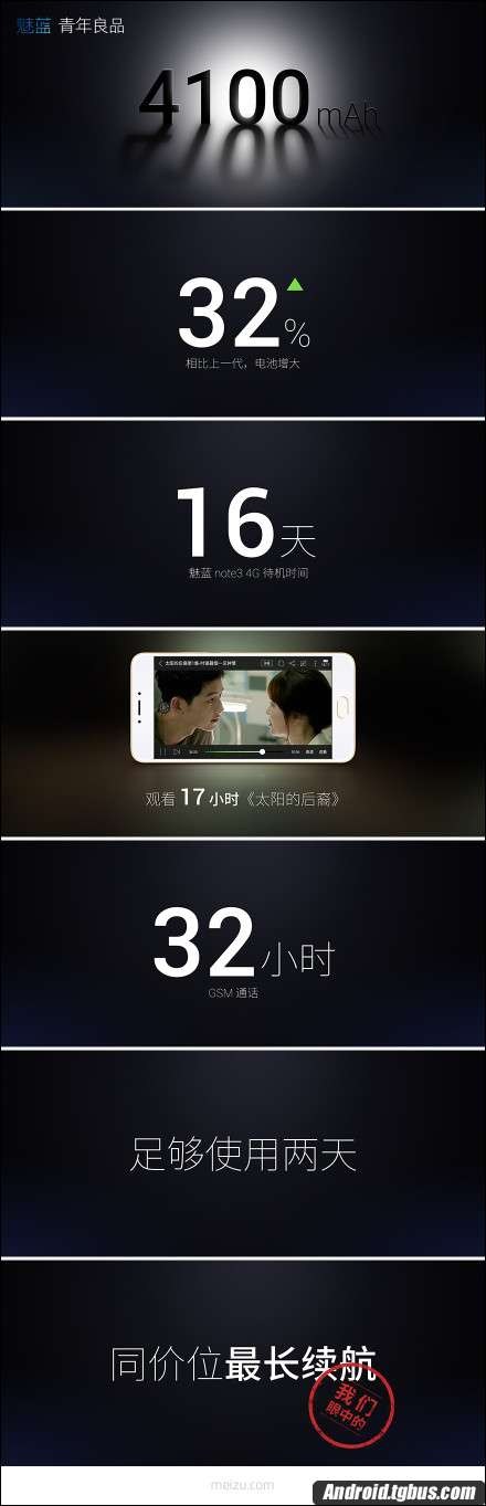 此次電池是魅族Note3最大的亮點,高低配版均采用了4100mAh的超大電池容量,同時還將機身厚度控制到了8.2mm,機身重量為163g,真正做到了薄得持久。至於魅藍note3續航怎麼樣,目前從官方提供的數據來看,該手機可持續待機16天,同時配合Flyme 5.1的省電優化以及Helio P10低功耗處理器,重度使用一天也毫無壓力。據悉,如果用魅藍note3來太陽的後裔,你可以從第一集看到最新一集,還剩5集的電量,是不是很棒呢?