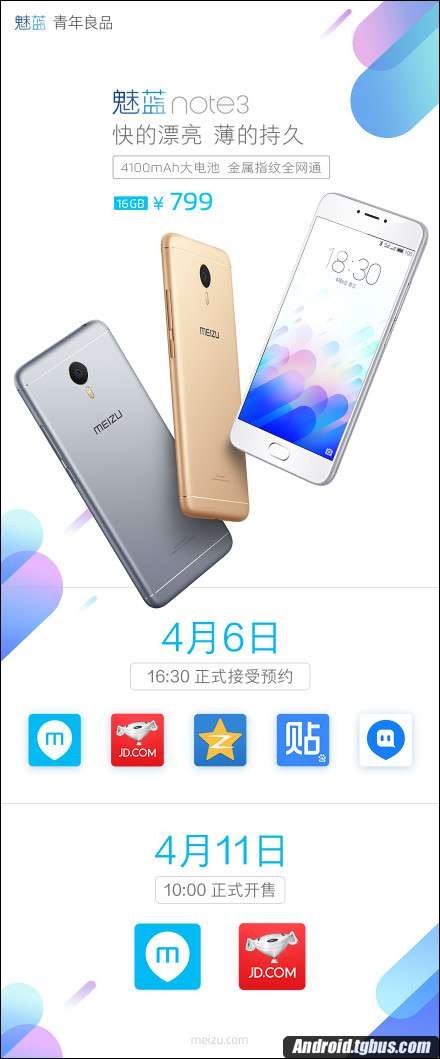 至於魅藍note3開賣時間,據悉該機已於今天下午4:30開始官網預約,4月11日正式開賣。同時在價格方面,魅藍Note 3 16GB版本售價為799元,32GB版本售價999元,有興趣的朋友可以關注。