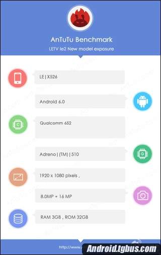 安兔兔的配置信息顯示樂視超級手機2並未采用之前盛傳的高通骁龍820處理器,而是稍微低一點的骁龍652。安兔兔表示,樂視超級手機2代號為LE|X526,搭載高通骁龍652處理器,采用3GB RAM+32GB ROM存儲組合,屏幕分辨率為1080P,攝像頭為800萬+1600萬,手機運行安卓6.0系統。目前提交的跑分成績為7.5萬。