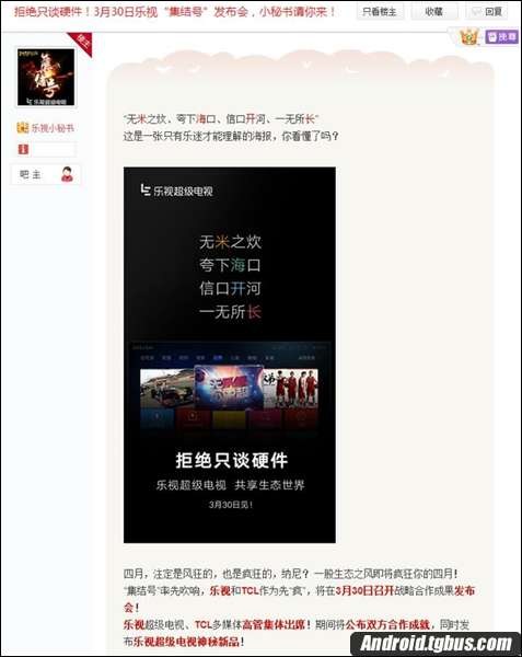 據悉,樂視全新的曲面屏電視終於要來了,這款全新的曲面屏電視將於後天(3月30日)聯合TCL發布。