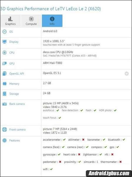 現在樂視再次曝光了最新消息,樂視手機2有高配版,而處理器將升級為Helio X25。至於配置,國外跑分平台GeekBench數據顯示,樂視手機2代高配版采用5.5英寸1080P屏幕,搭載聯發科MT6797T處理器,內置3GB RAM+32GB ROM存儲組合,前置800萬+1600萬像素後置攝像頭,運行Android 6.0系統。